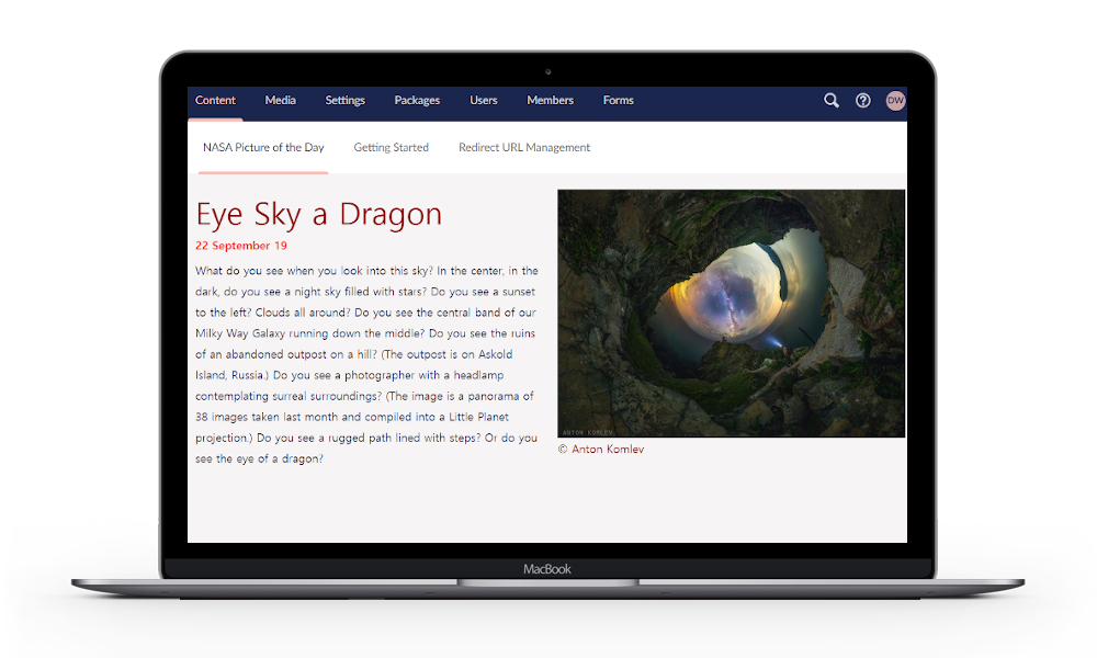 I created a custom welcome dashboard to display Nasa's Picture of the day in Umbraco 8
