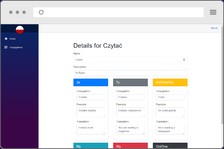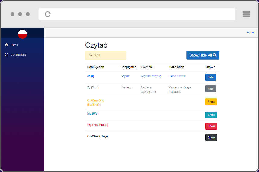 So I had to think of something cool to build using this new framework. At the time I had just begun learning Polish, so I decided to create a tool for myself to help me remember conjugations of verbs.