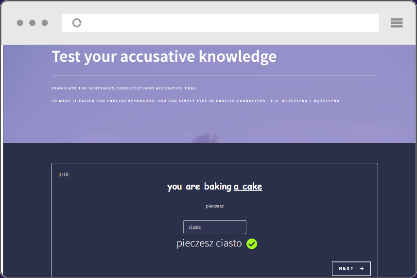 Accusative & Instrumental, require you to type in the correct words in the specified case. The tool is smart enough to recognise your answers if you type them with English characters instead of Polish characters. So for example: 'te kobiete' will be correct and so would 'tę kobietę'.