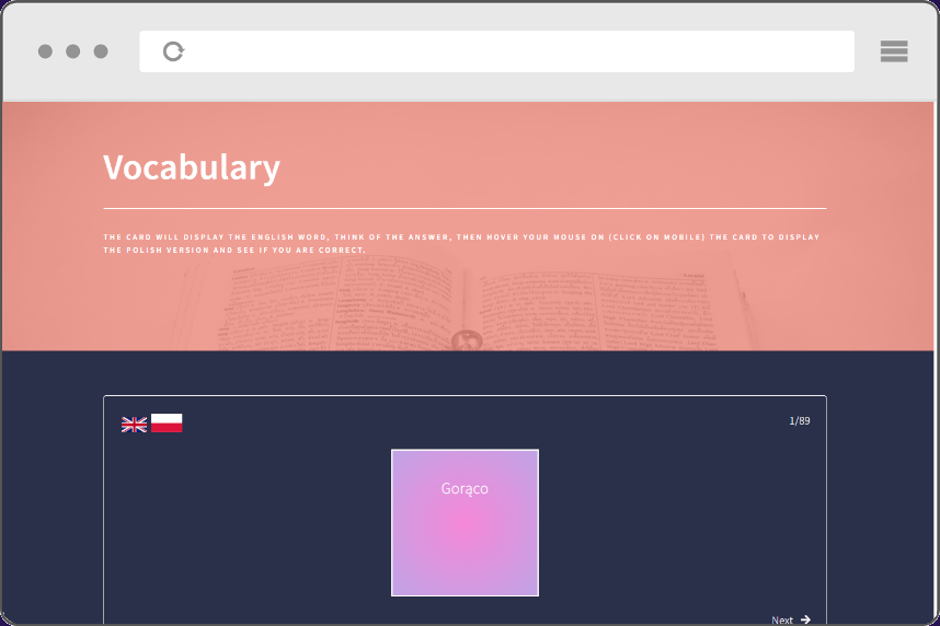 Vocabulary & Perfective consist of flip cards. For vocabulary, you can choose the side of the card you want to see e.g. English/Polish. Once you think you know the answer, hover your mouse over the card (click on mobile) and watch the card flip to reveal whether you were correct or not.