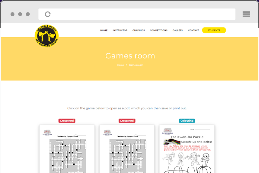 For younger students there is a games room, which is made up of PDFs that can be printed, There are colouring in, crosswords and 'fill in the blank' games.....All Taekwondo themed.